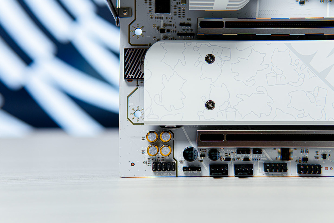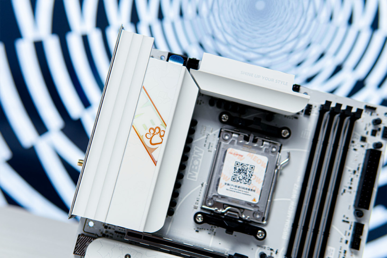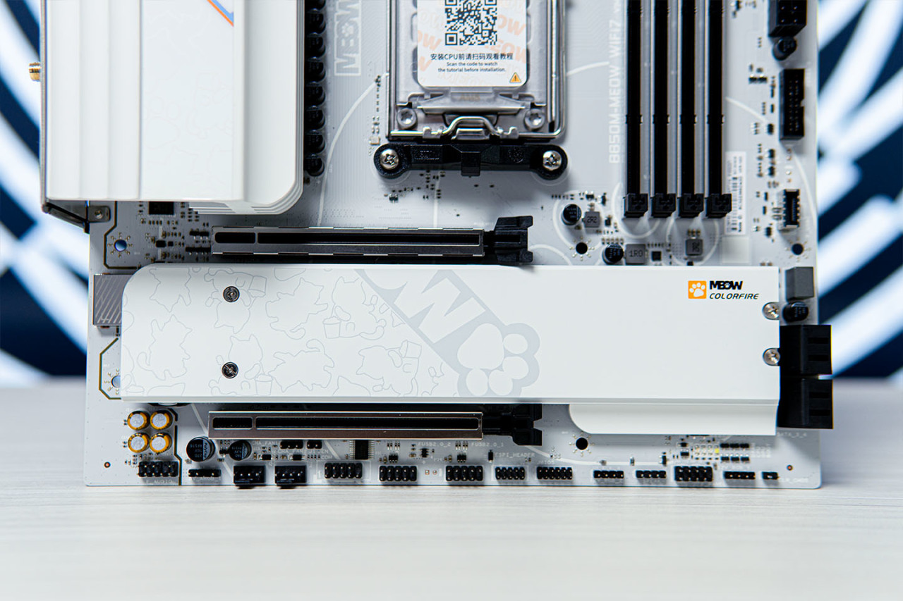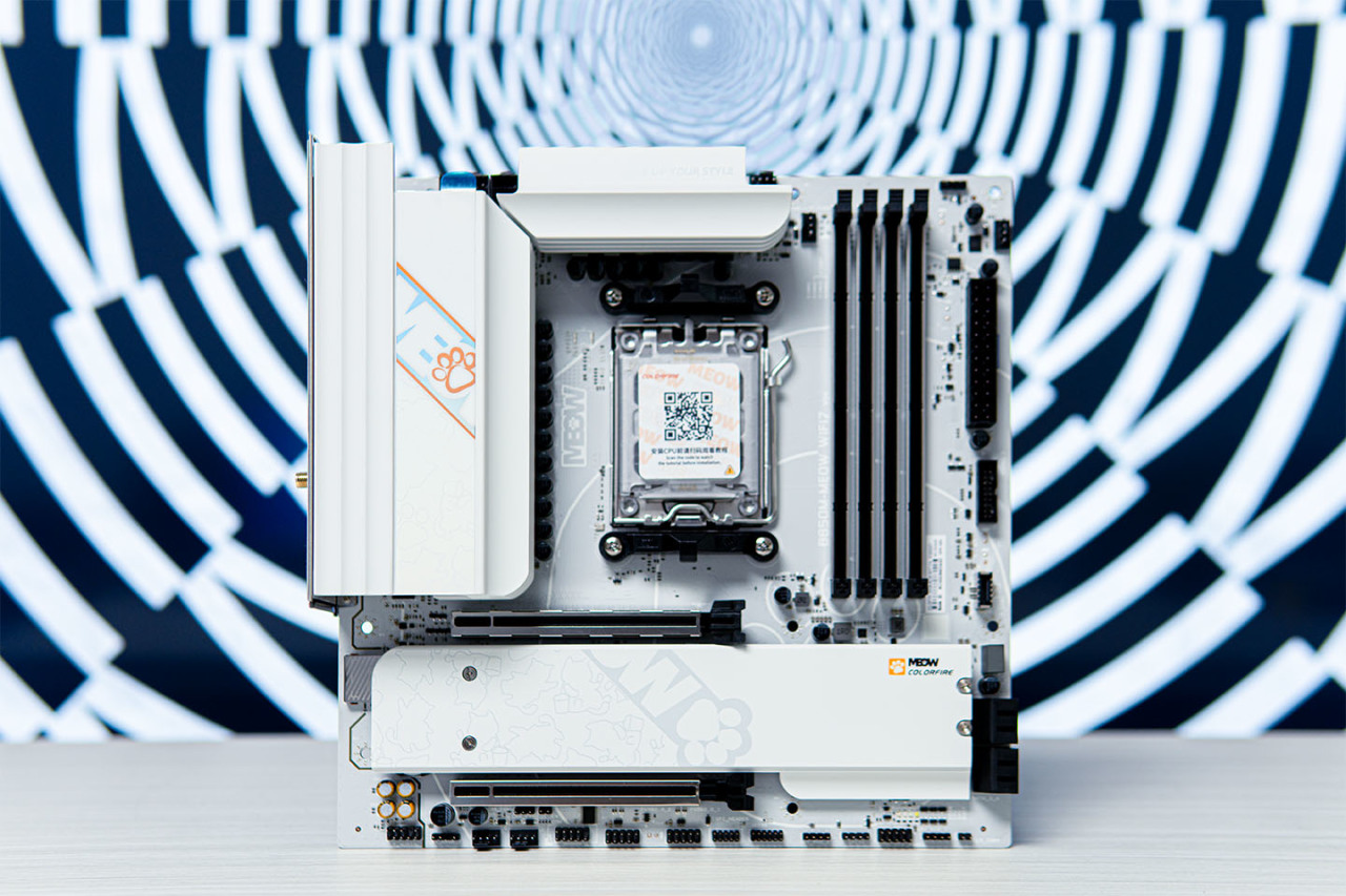 同为橘猫系列,七彩虹B850M MEOW WIFI7弱化了橘猫元素,官方也称之为“白橘猫”,简约外观设计和其他硬件更好搭配,非常适合海景房和侧透机箱使用。