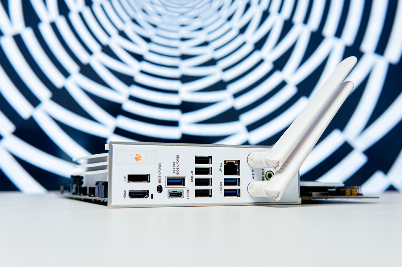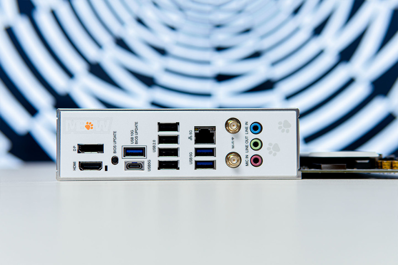 尾部按键接口包含USB2.0*4、USB3.2 Gen1*2、USB3.2 Gen 2*1、USB 3.2 Gen1 Type C*1、DP1.2、HDMI1.4、5G网口、WiFi天线接口、BIOS更新键、3个3.5mm音频接口,接口丰富度还是可以的。