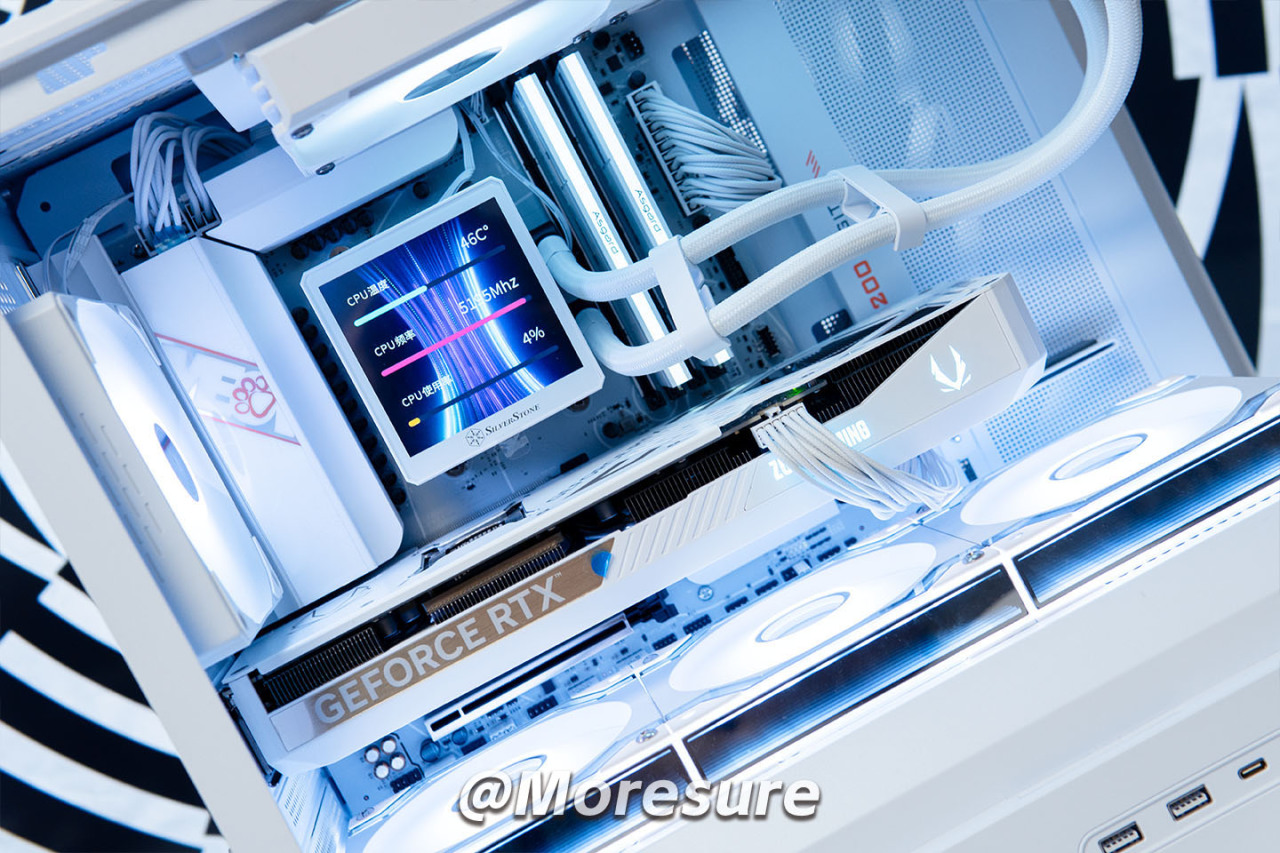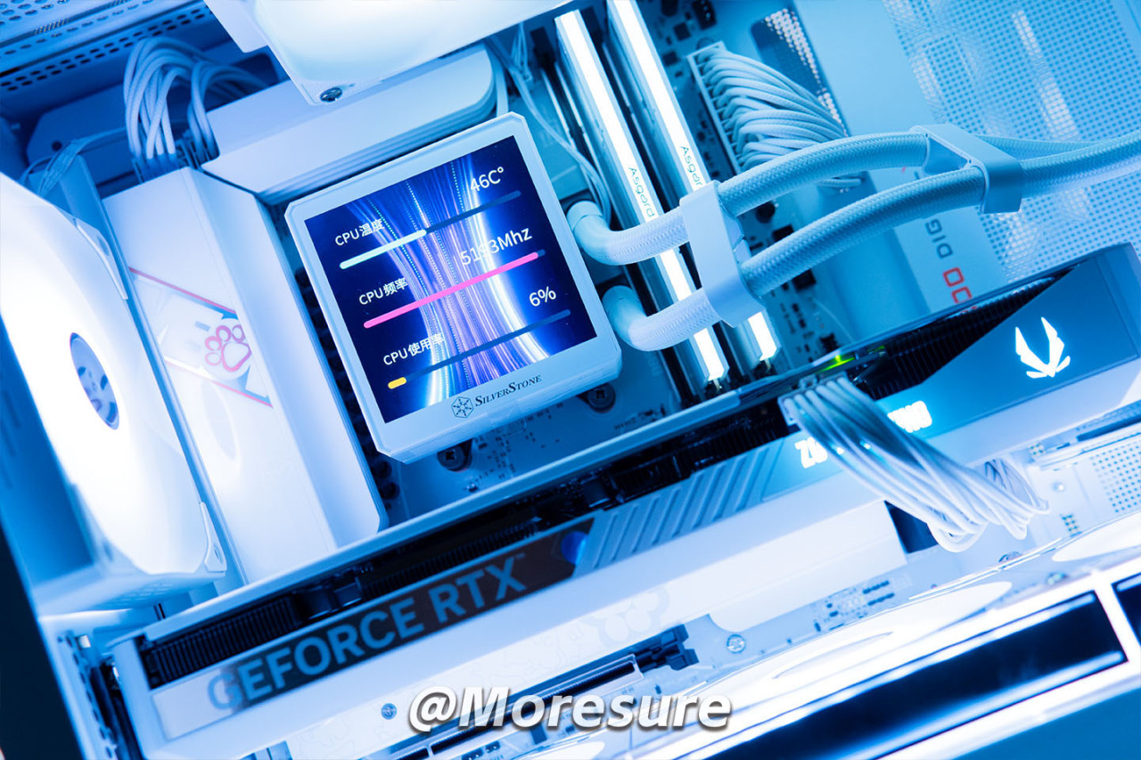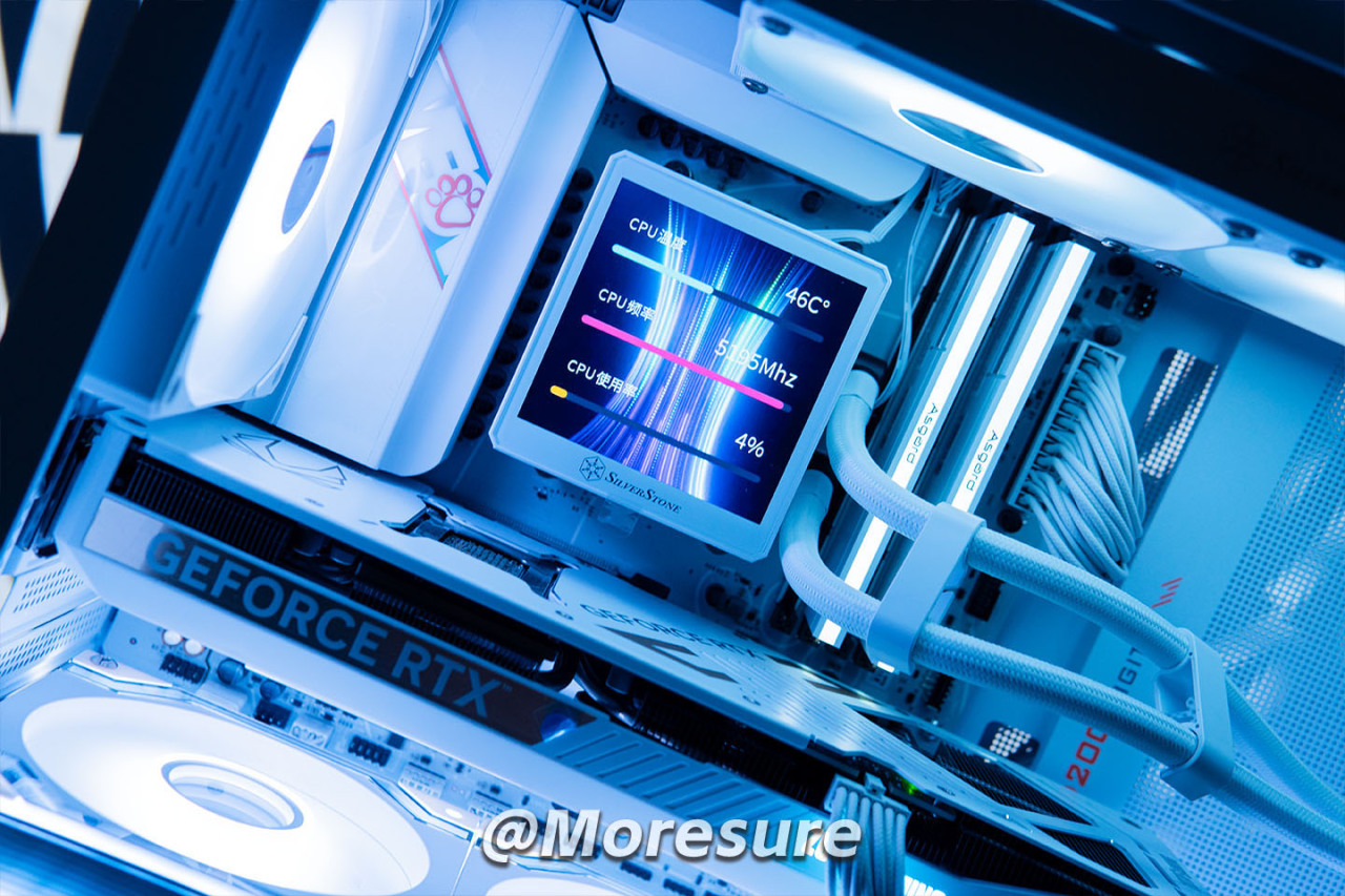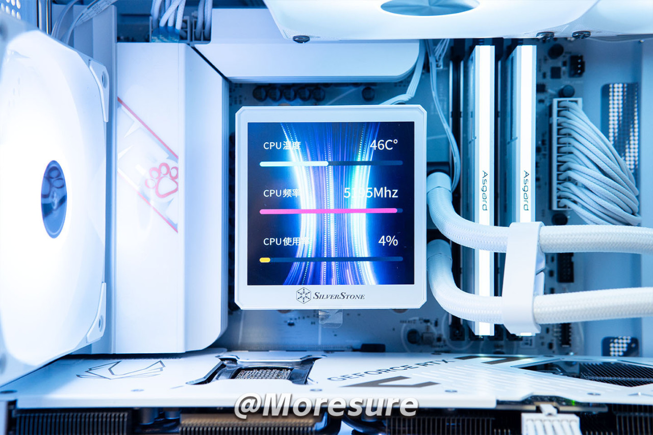 银昕Silverstone E240 MAX冷头带有一块3.95英寸大屏,可以监控硬件运行状态以及自定义各种静态、动态图片,方形三窄边屏幕色彩显示效果不错,正常距离观看显示十分细腻。