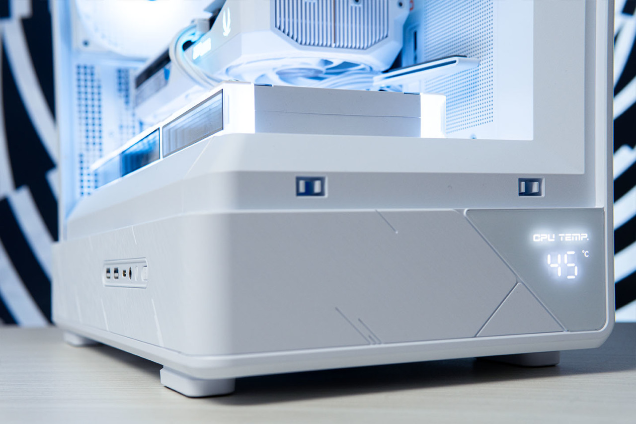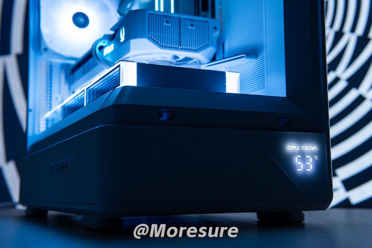正面右下角梯形区域有一块数显屏,可以显示CPU温度。