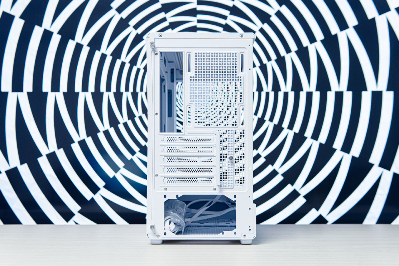 机箱尾部可以看到5个PCI挡板,上方支持12cm风扇。左右两侧面板均使用手拧螺丝固定,拆卸比较方便。