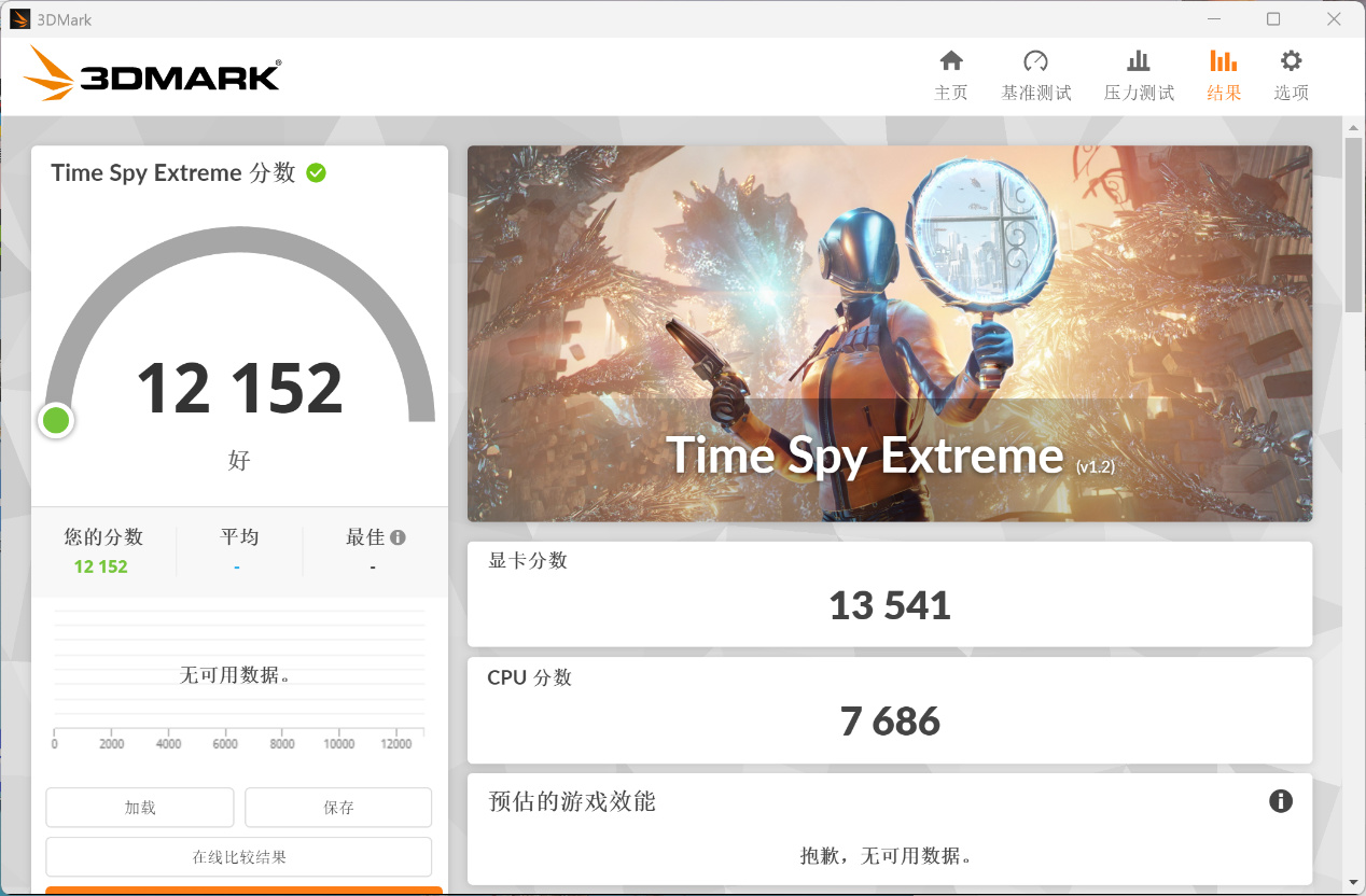 3DMARK Time Spy Extreme测试中,整机得分12152,显卡得分13541,CPU得分7686。