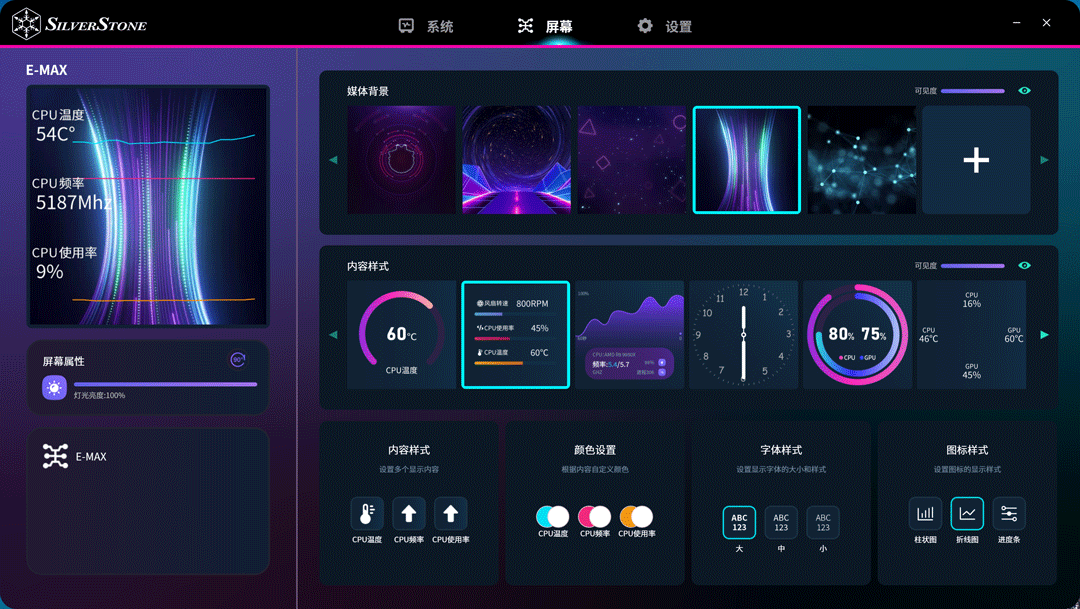 通过驱动可以设置屏幕的背景、内容样式、字体样式、颜色、图标样式等,银昕的驱动界面十分的规整,上手没难度。