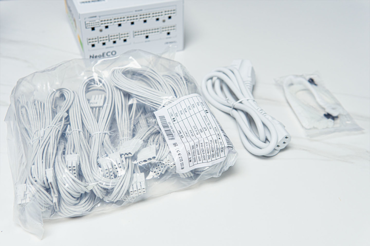 电源接口和线材接口均为白色,非常适合搭配纯白主板使用,另外所有线材均为单根压纹线,装机走线、理线会更加自由。