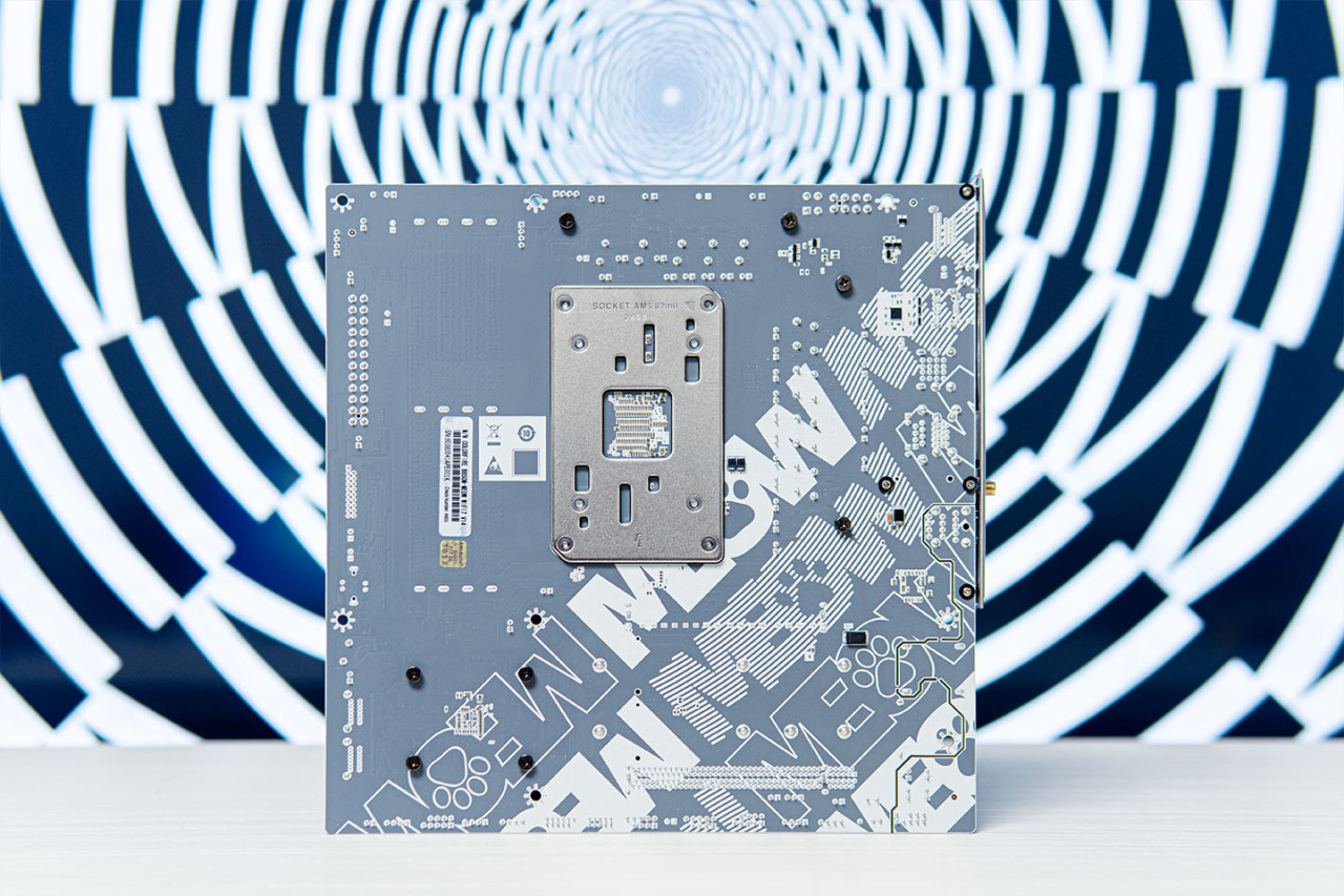 七彩虹B850M MEOW WIFI7主板背部有大面积MEOW图案装饰,CPU位置做了金属加固。