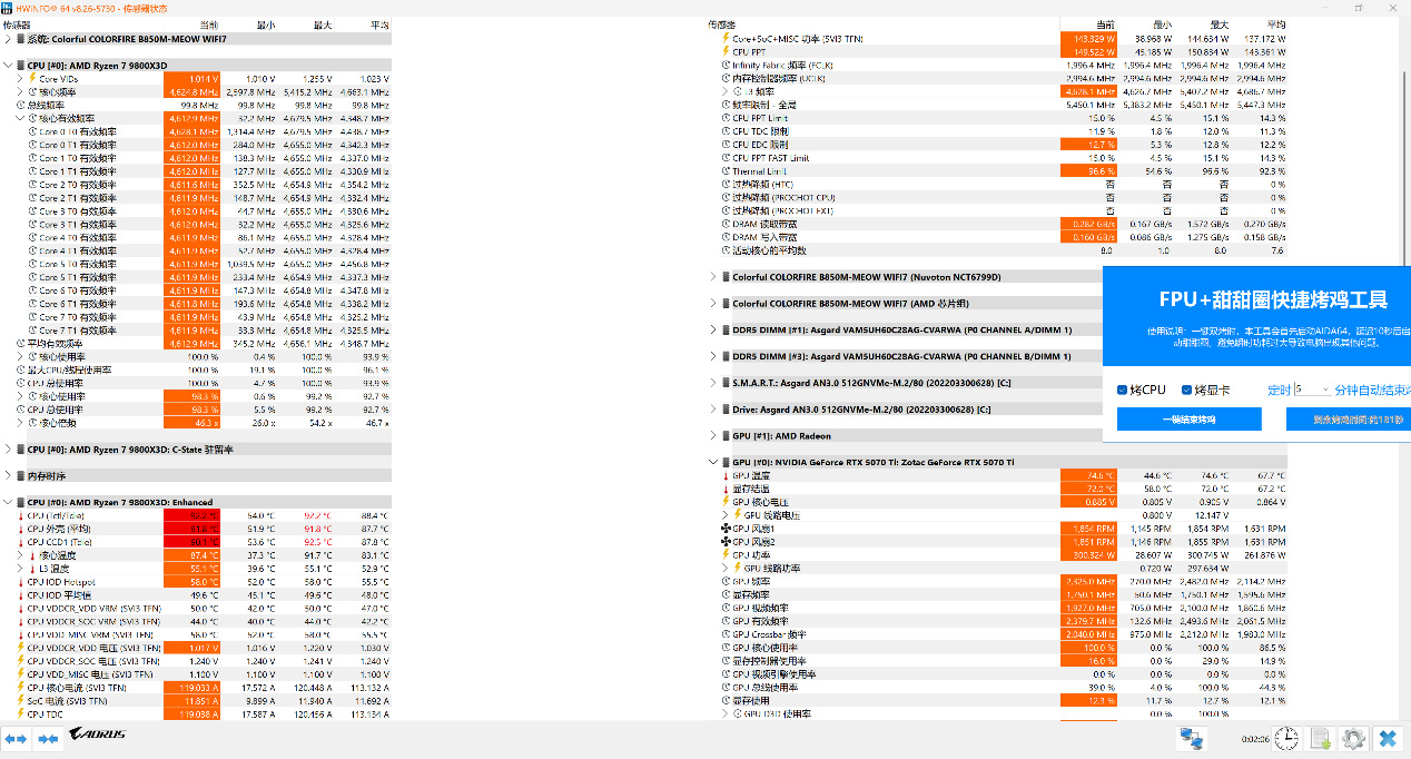 双烤测试中,9800x3D频率稳定4.61GHz,温度92摄氏度,功耗140W,索泰RTX5070Ti 白OC功耗300W,频率稳定2325MHz,温度74.6摄氏度,各位可别再说乔思伯闷罐了~~