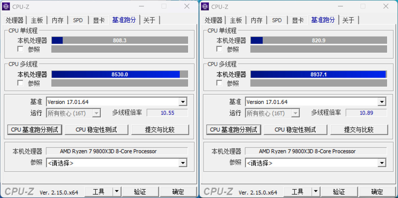 使用CPU-Z测试,默认情况下,9800x3D单核得分808,多核得分8530,开启PBO后,单核得分820,多核得分8917,七彩虹精准增压超频配合PBO对性能提升非常明显。