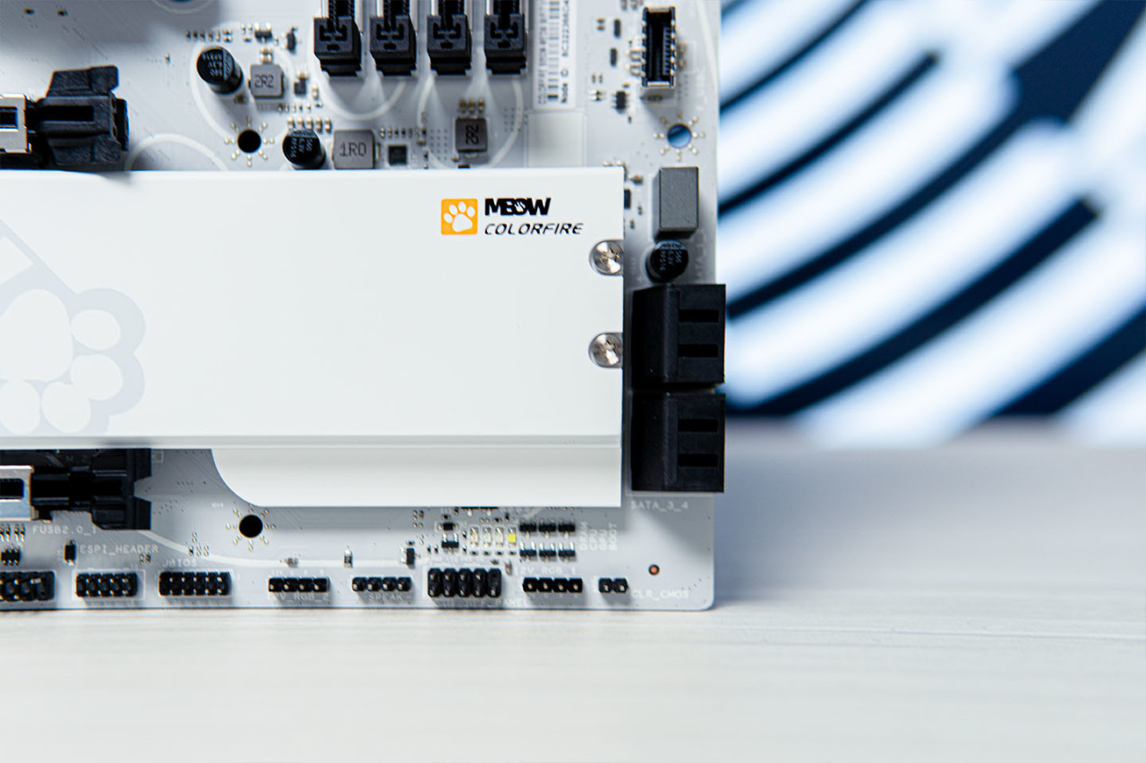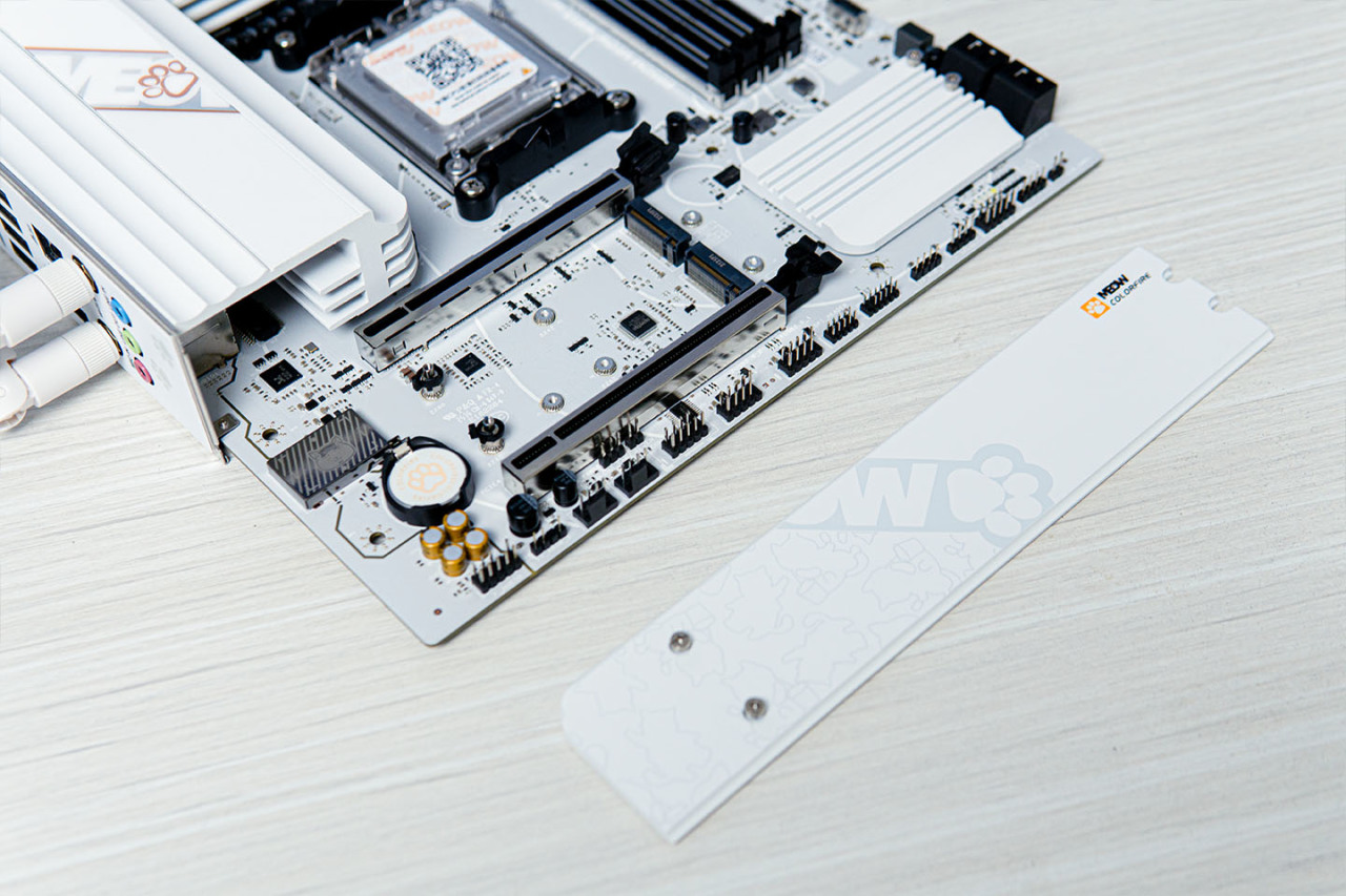 M.2 SSD位置,七彩虹B850M MEOW WIFI7主板也是覆盖上一整块散热马甲,两颗螺丝固定,一端为插入式卡扣,拧螺丝时不用找孔位方便不少。