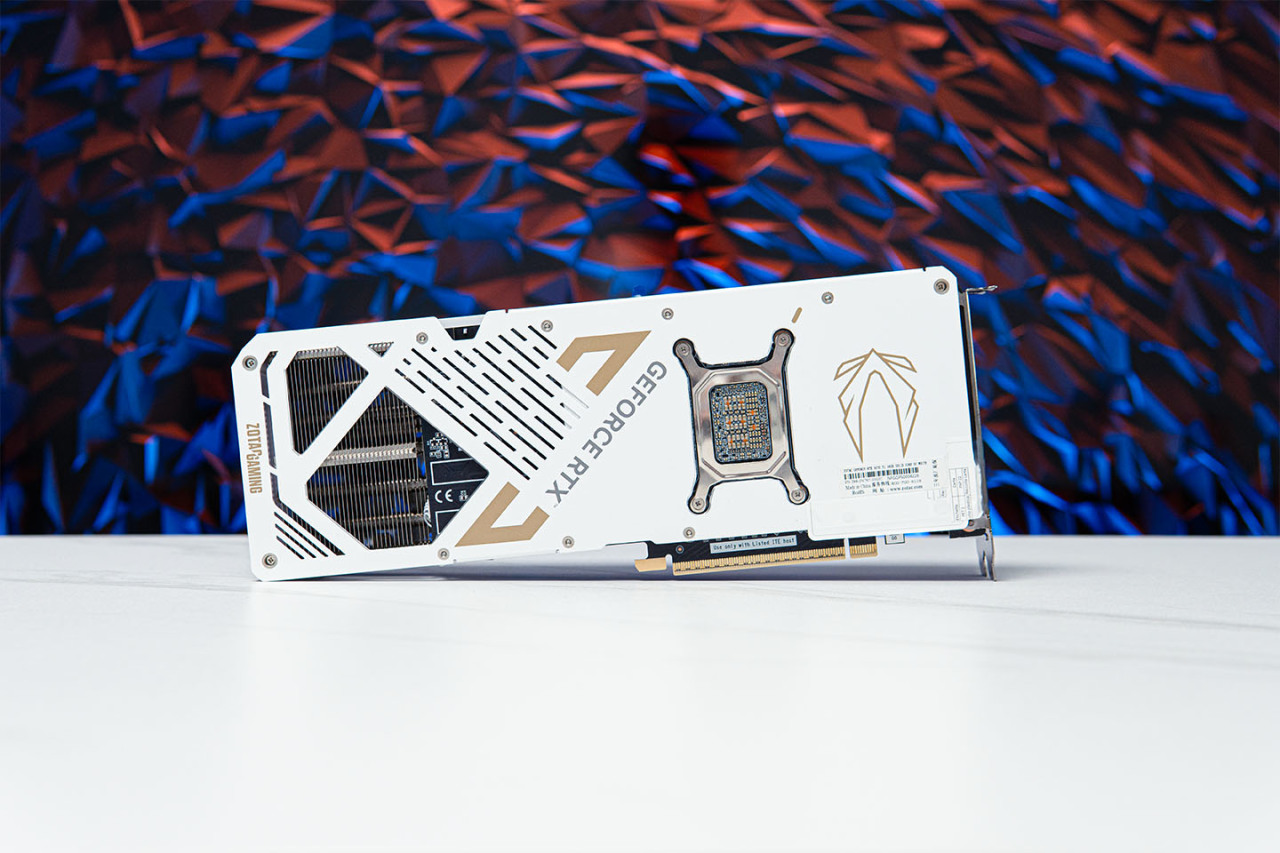 索泰RTX 5070 Ti SOLID白背面使用了高强度合金背板,可以提升显卡强度,提升静电防护能力,并且有一定辅助散热效果,贯穿式风道内可以隐约看到5根散热铜管,其内部鳍片也是相当密集。