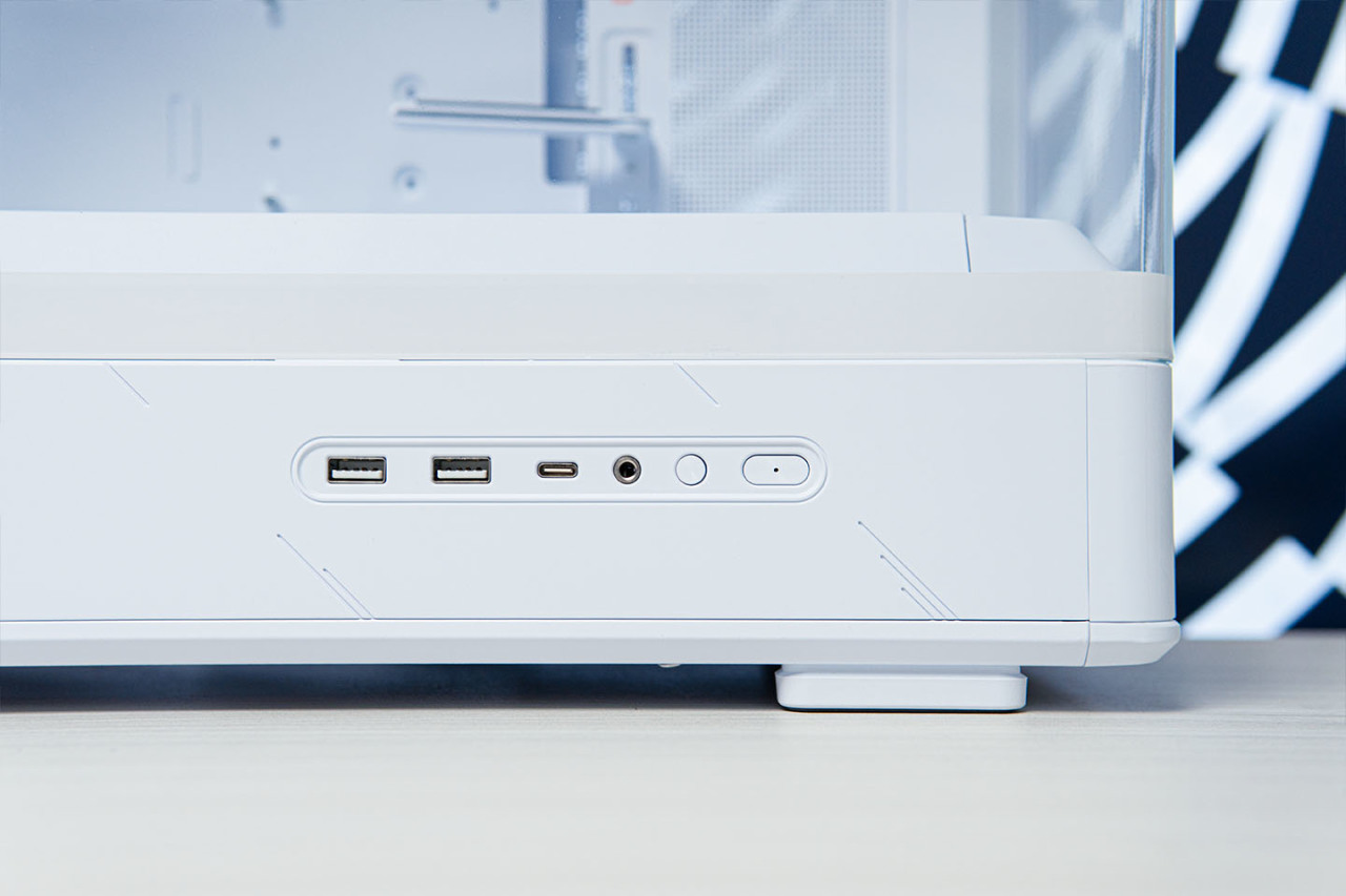 接口包含USB3.0*2、USB 3.2 Gen 2 Type C、3.5mm音频口、重启键、开机键。