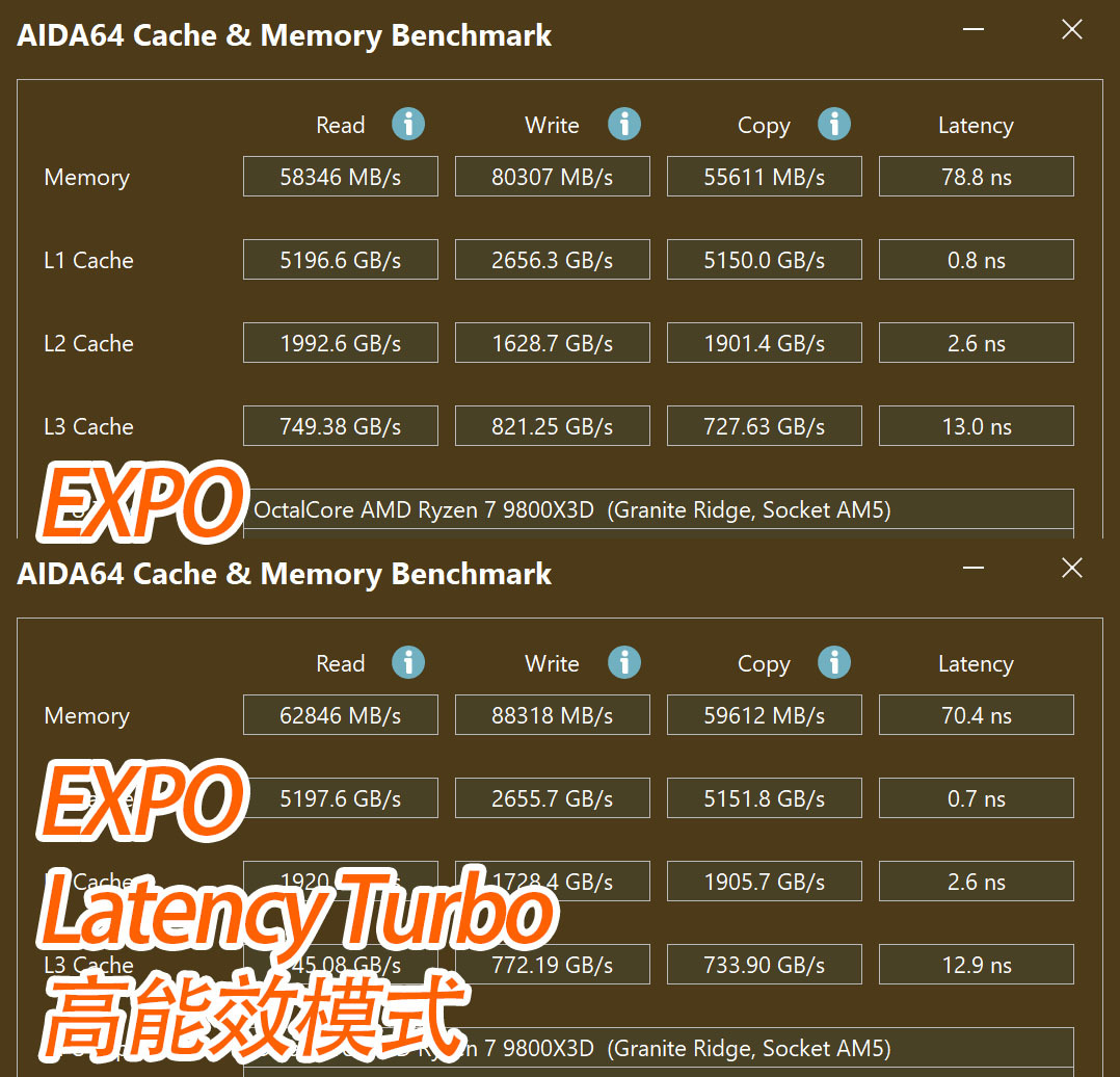 阿斯加特女武神·瓦尔基里II代开启EXPO可提升到6000MHz,读写拷贝速度分别为58346、80307、55611MB/s,延迟为78.8ns,在BIOS中开启低延迟和高能效模式后,读写拷贝分别为62846、88318、59612MB/s,延迟降低到70.4ns,综合提升8%左右。