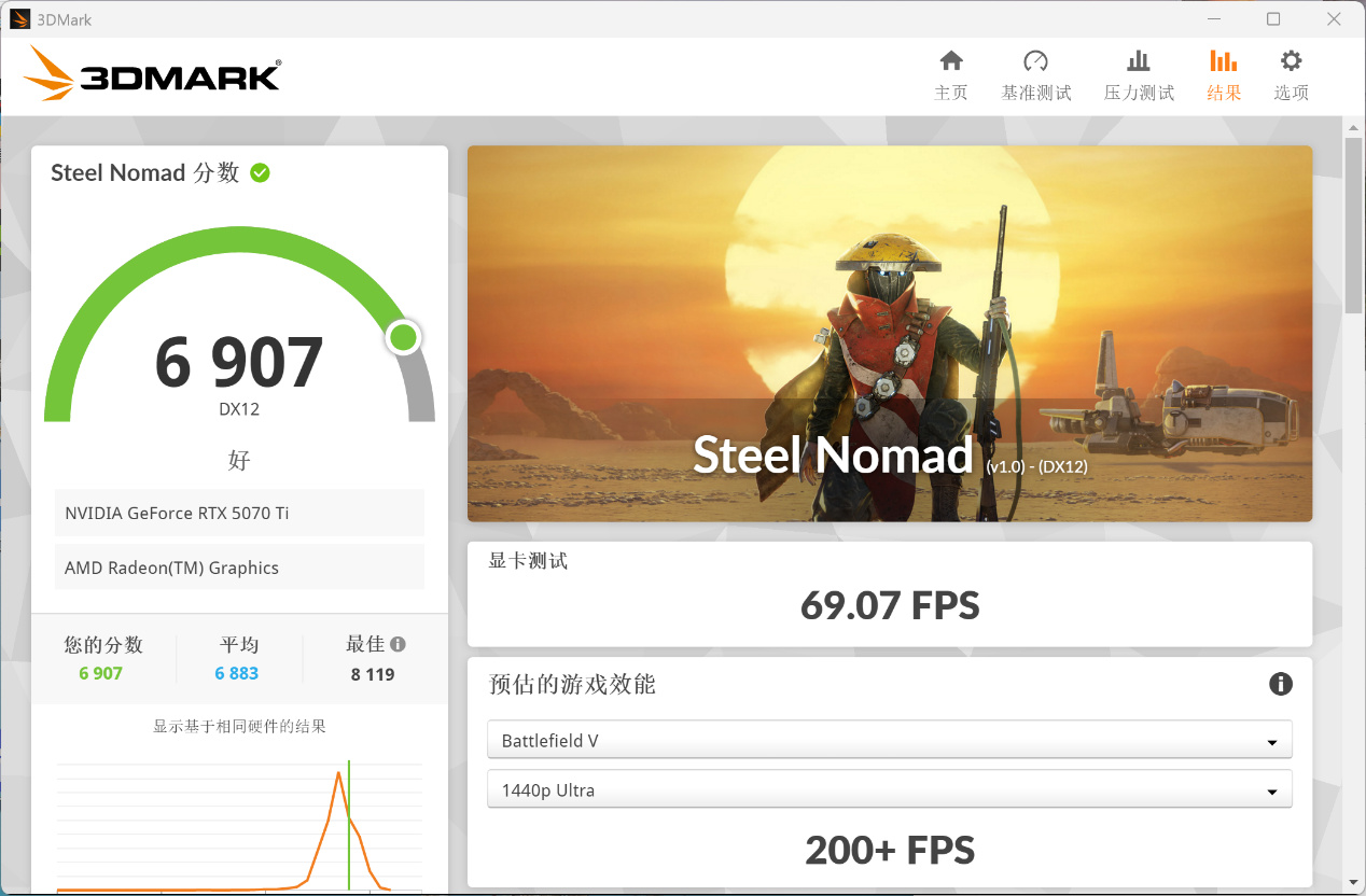 3DMARK Steel Nomad测试中,整机得分6907,预测2K分辨率下《战地5》200+FPS,运行流畅。