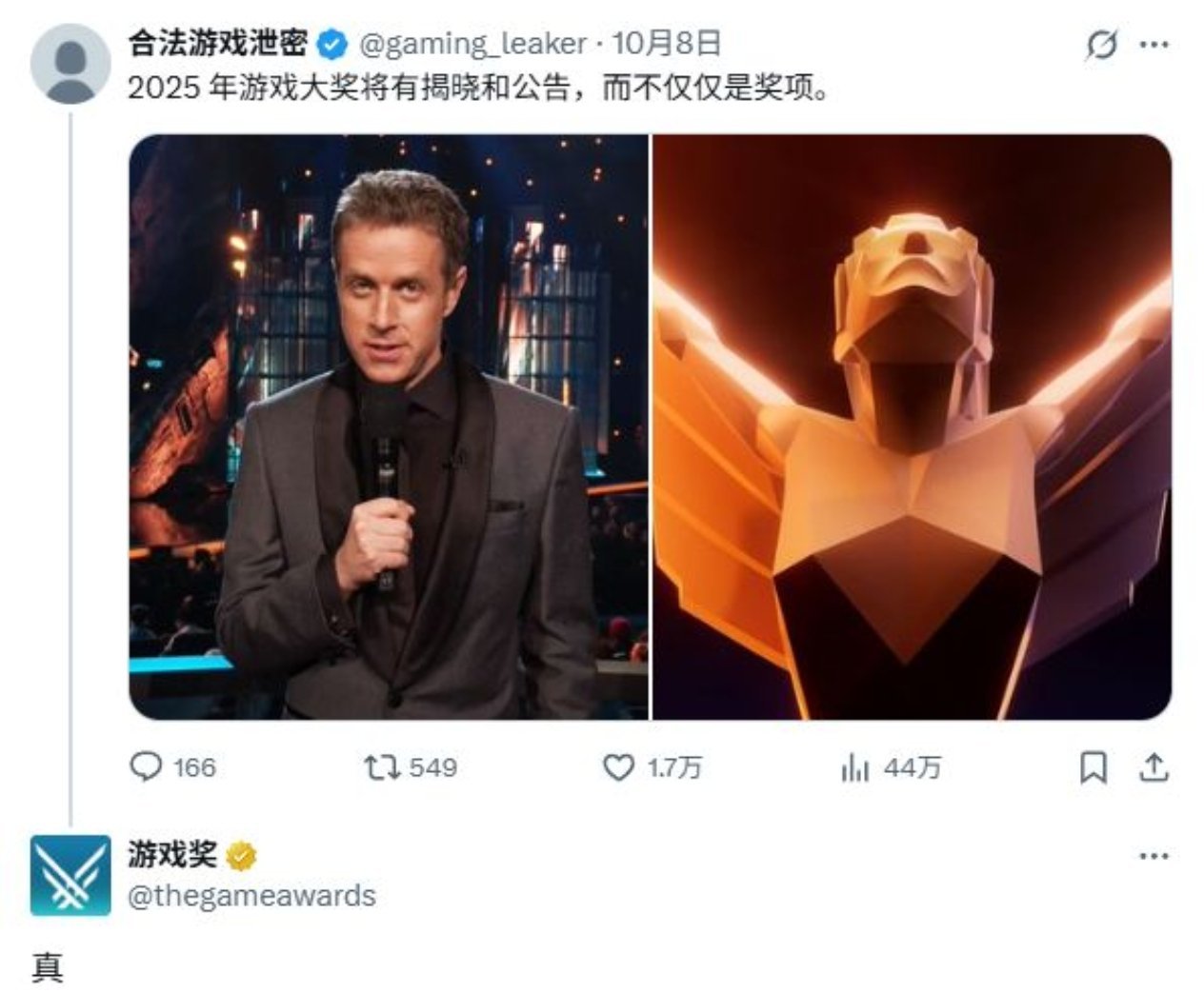 一位名为gaming_leaker的用户近日在社交平台发布“爆料”,称2025年的TGA盛典除了常规颁奖外,还将包含新游戏的首次公开与预告片发布。当其他玩家追问消息真实性时,TGA官方账号直接转发了该内容并回复“True”,确认了这一安排。