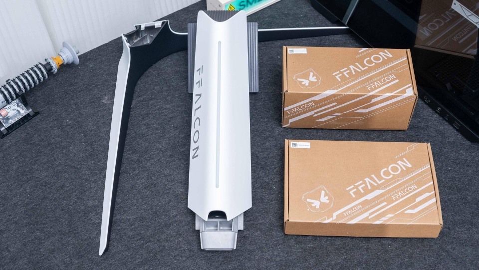 附件方面,外置电源适配器依旧保留。依旧是鸡爪式设计的显示器支架,显示器线材附件和外置电源适配器都有专门的包装盒。