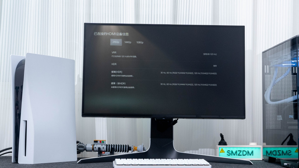 實測搭配PS5 遊戲主機,可以在已連接的HDMI 設備信息中看到,雷鳥27U8 顯示器支持4K 120Hz HDR 模式,還支持 ALLM 和 VRR 的 48-120Hz 自適應刷新率。