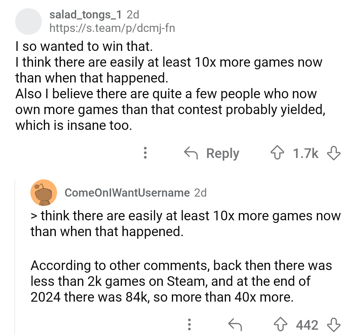 > 现在游戏数量怕是当时的10倍不止,「根据其他评论,当时Steam游戏不到2000款,2024年底已有8.4万款——翻了40多倍」