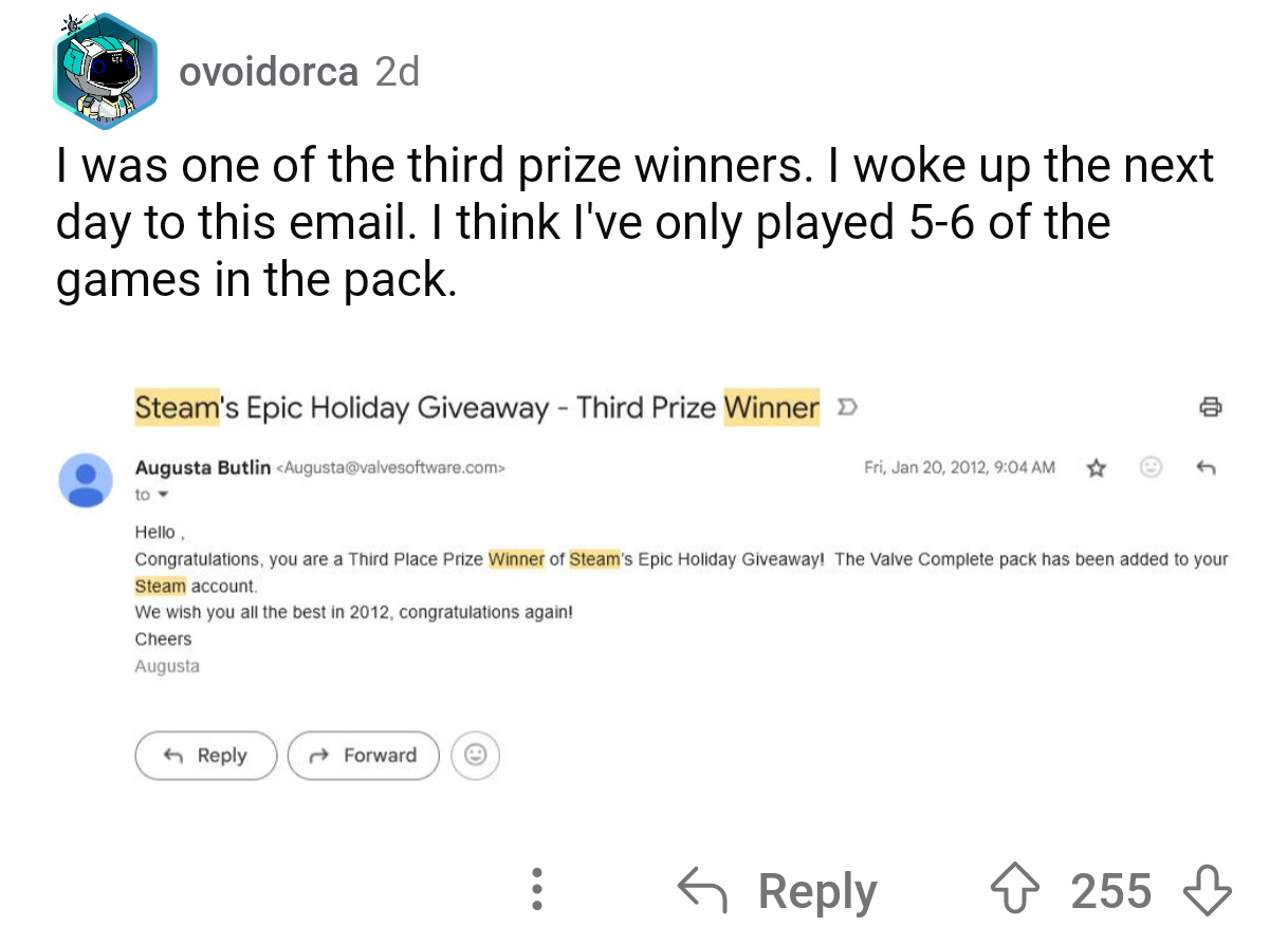 「我是三等奖得主之一,第二天醒来就收到这封邮件。但那个游戏包里的游戏我只玩了5-6款」