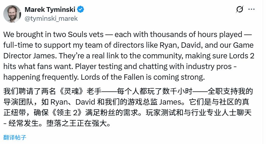 近日,CI Games CEO Marek Tyminski在X上发布了一条更新,详细分享了《堕落之主2》的开发进展。这条帖子迅速引发了粉丝的热议,因为它直接回应了前作的痛点,并展示了公司对社区反馈的重视。Marek在帖子中写道:“我们邀请了两位魂系老兵——他们各自拥有数千小时的游戏经验——全职加入团队,协助包括Ryan、David以及游戏总监James在内的导演组。他们是我们与玩家社区之间的真正桥梁,确保《堕落之主2》能打中粉丝想要的感觉。玩家测试与业内专家讨论正在频繁进行中。