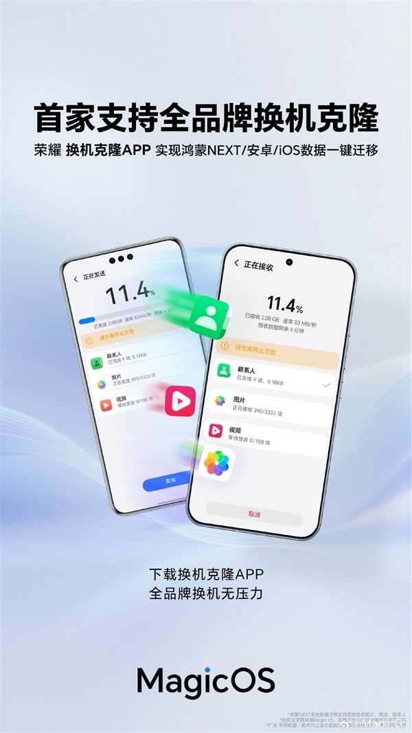 據悉,早在今年6月榮耀就宣佈首次實現iOS、鴻蒙、安卓三系統手機互聯分享,實現數據高速互傳,這是手機行業第一次實現全系統覆蓋。