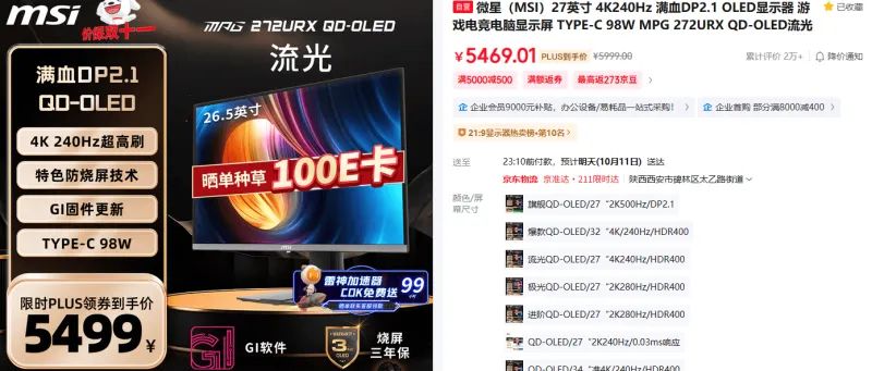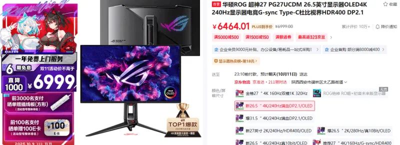 第3款微星和第4款華碩,都使用了三星QD-OLED最新款面板,DP2.1 滿血接口,可以跑滿原生4K240Hz