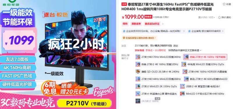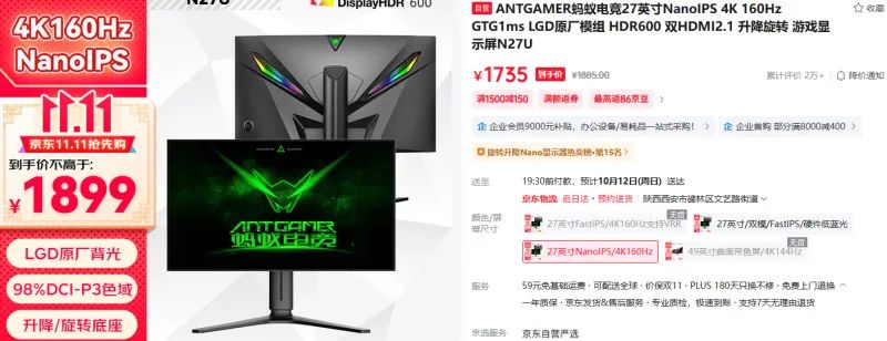 目前主打性價比的27英寸4K160Hz  友達7.0 自組背光的面板,價位1099左右, 同面板產品性能表現基本差不多,主打一個性價比,不要期待太高哈