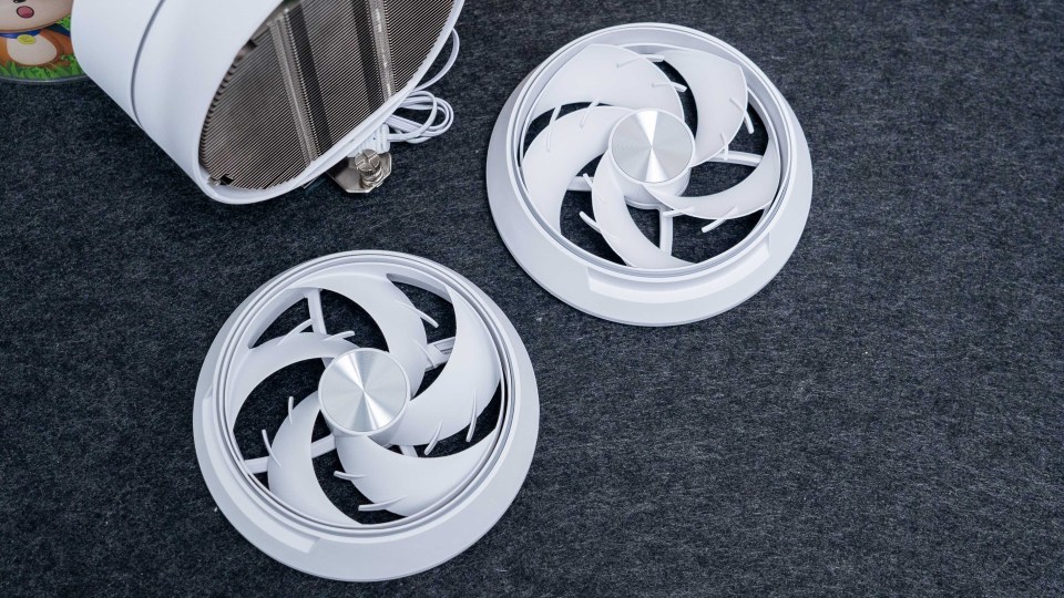 圆形的散热主体在风冷产品中真的是非常少见的造型了,两侧设计了两把磁吸风扇设计。正反叶设计,5片扇叶设计也犹如飞机发动机造型。