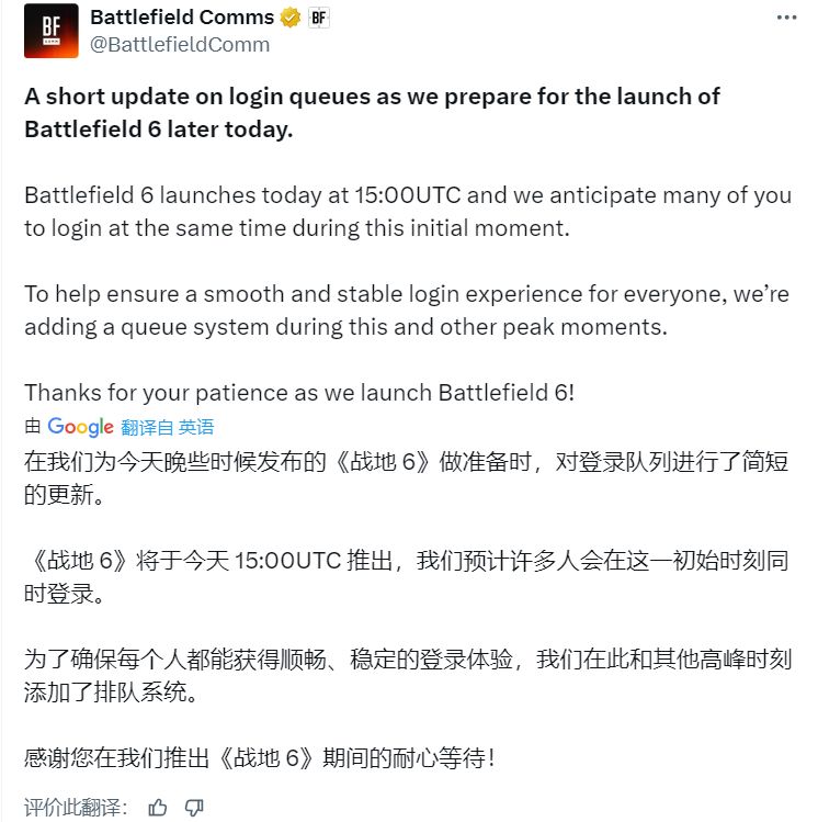 最后,官方感谢玩家对《战地6》的大力支持与耐心等待。