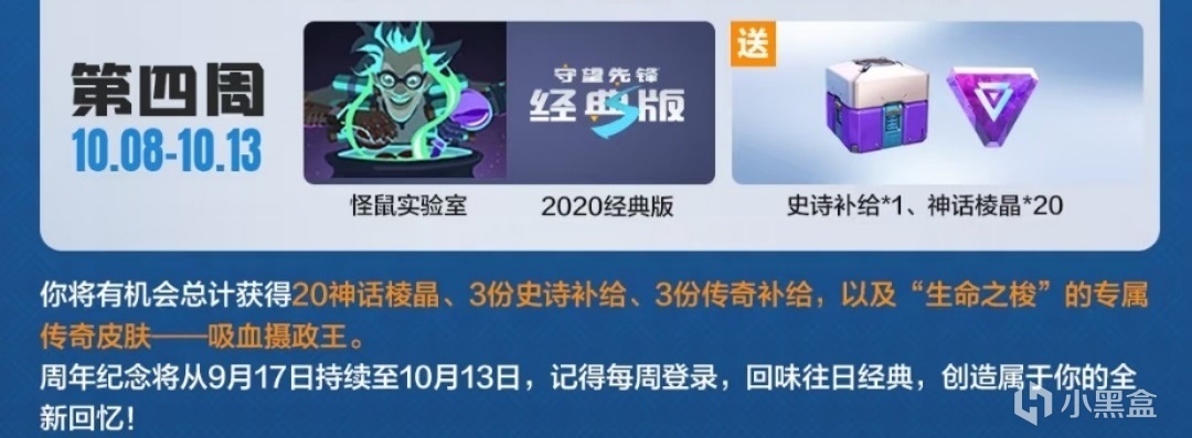 守望先鋒9週年活動,持續4周截止時間爲10月13號。每週輪換新活動與獎勵,第4周活動截止時間爲10月13號,下週一。