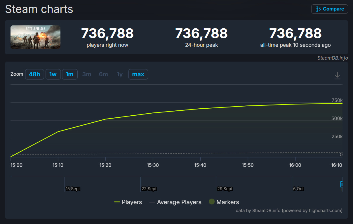 《战地6》现已正式发售,国区售价¥268/468,升级包¥200。目前游戏服务器已满,Steam在线人数突破至73万。