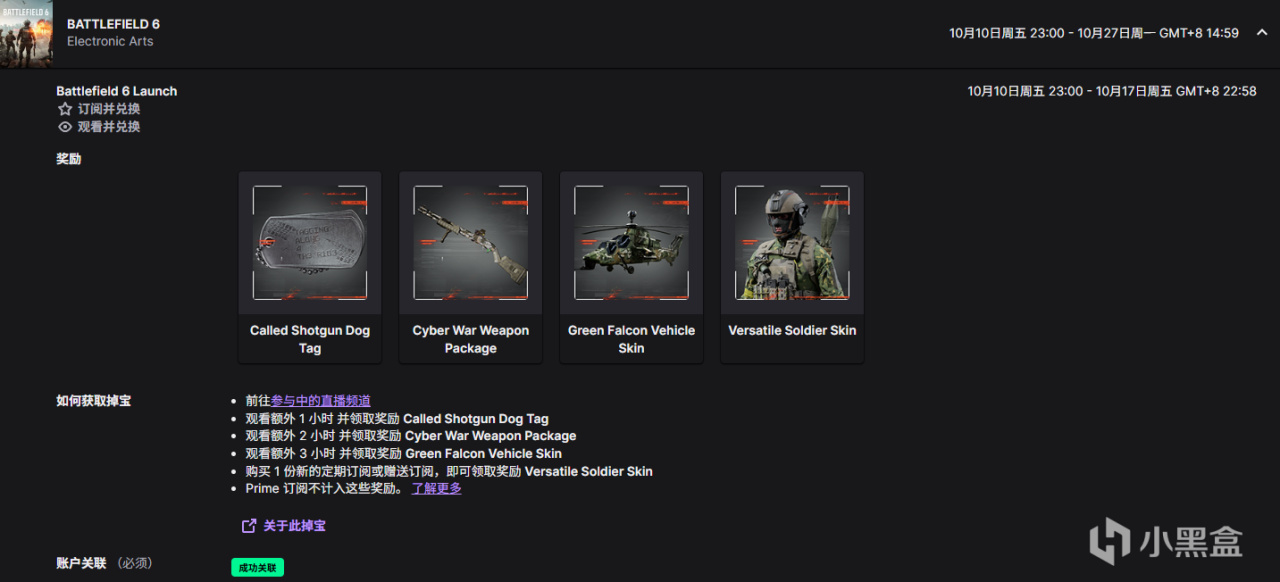 *一定要注意绑定好 EA 和 Twitch 账号,否则奖励不到账,绑定页面 - https://www.twitch.tv/drops/campaigns: