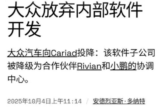 近日,大众汽车集团对外宣布对其软件战略进行重大调整:不再以完全自研为目标,将旗下软件子公司 CARIAD从“核心开发者”降格为以维护与整合为主的协调者,并转向与外部软件厂商,包括中国的小鹏、美国的 Rivian 等建立更深层合作。此举被业界视为大众长期推动的“软件定义汽车”战略的一次重要校正。
