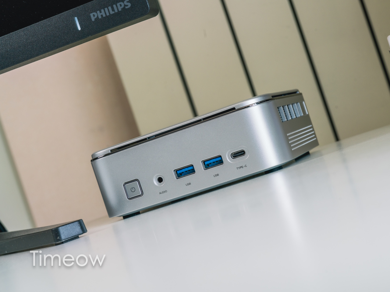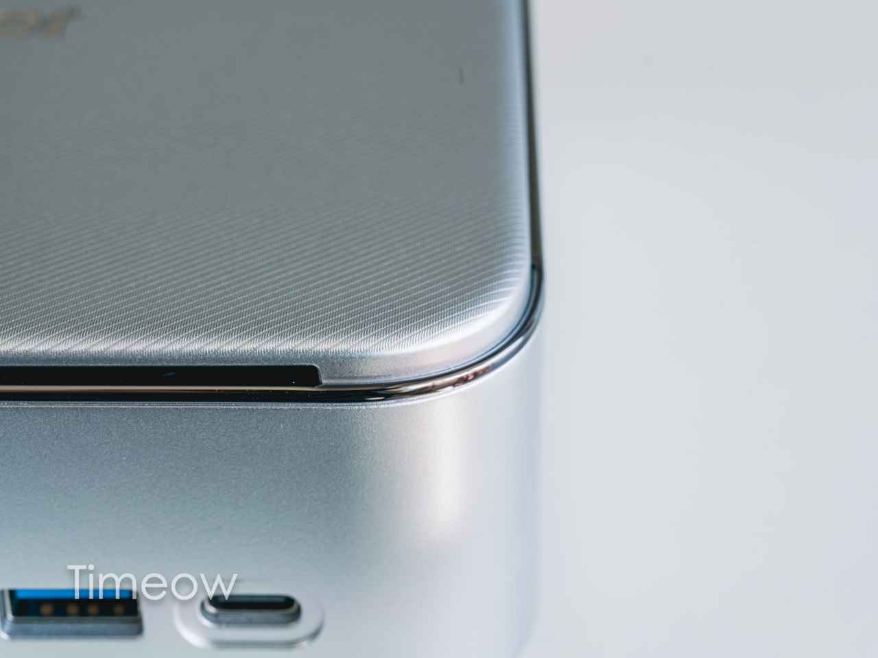 正前方,有兩個USB 3接口(5Gbps)和一個支持40Gbps的USB4接口(Type-C),以及電源鍵和3.5mm音頻接口,方便我們連接經常插拔的耳機、移動硬盤和U盤等設備。