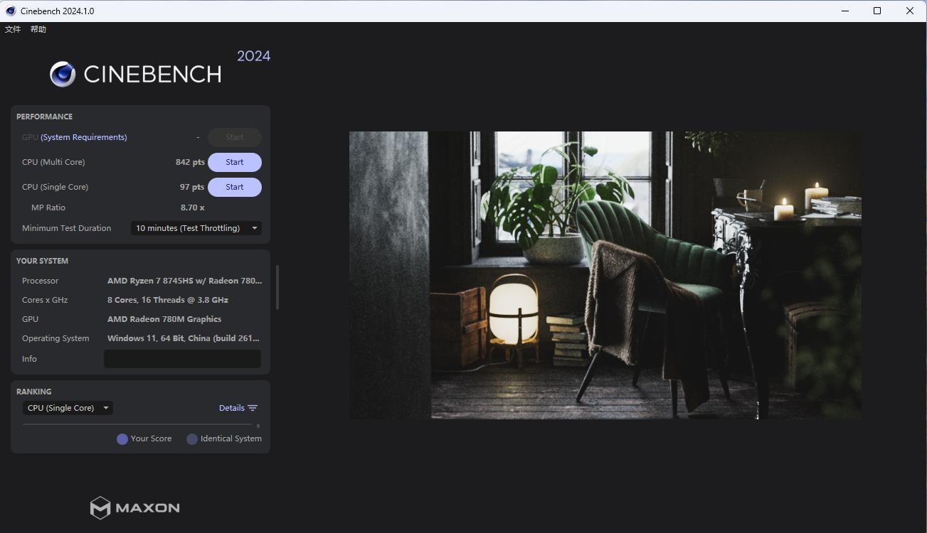Cinebench 2024採用了全新的機制,海爾雲悅mini R多核跑分842,單核跑分97,處理器性能釋放比桌面級的經典處理器5800X還要強。