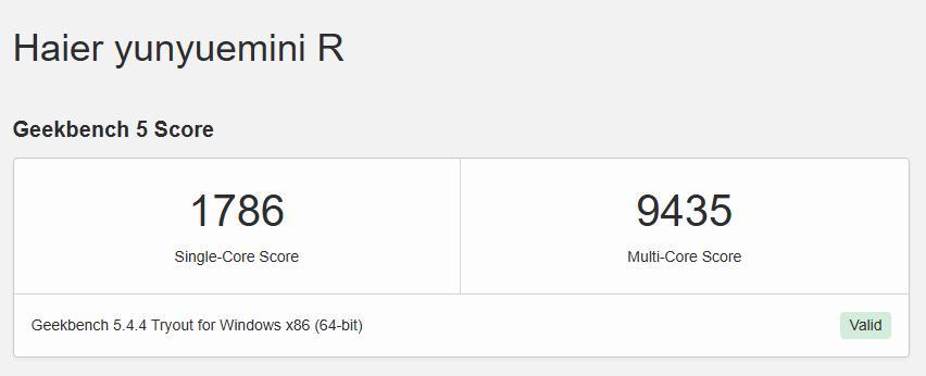 Geekbecnh 5跑分項目上,海爾雲悅mini R拿到了多核9435,單核1786的成績。多核比i5-12450H處理器的迷你主機高出一些,單核性能則少一些。