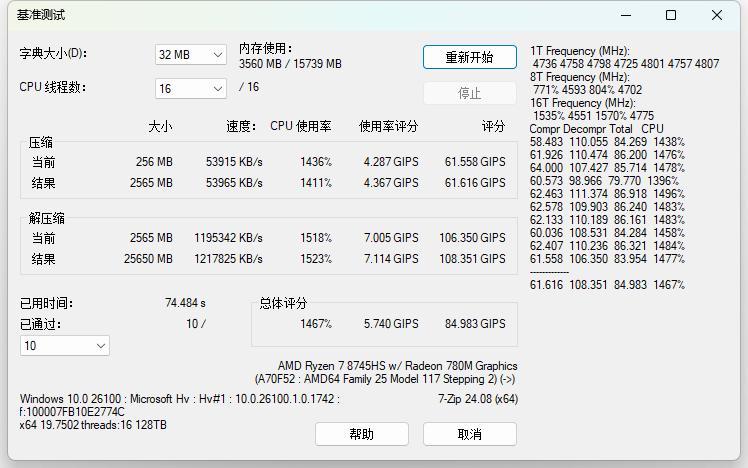 對於日常辦公來說,7-ZIP基準測試代表了整機的生產力性能,成績與CPU和內存性能強相關。