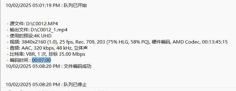 接着來看一下視頻轉碼,使用Adobe Media Encoder 2025對一個用索尼A7R2拍攝的、13分多鐘、H264格式、100Mbps的4K視頻轉碼,目標格式爲H265(HEVC)、35Mbps、4K(預設4K UHD),這個測試主要考驗了處理器或核顯/顯卡的編碼性能。