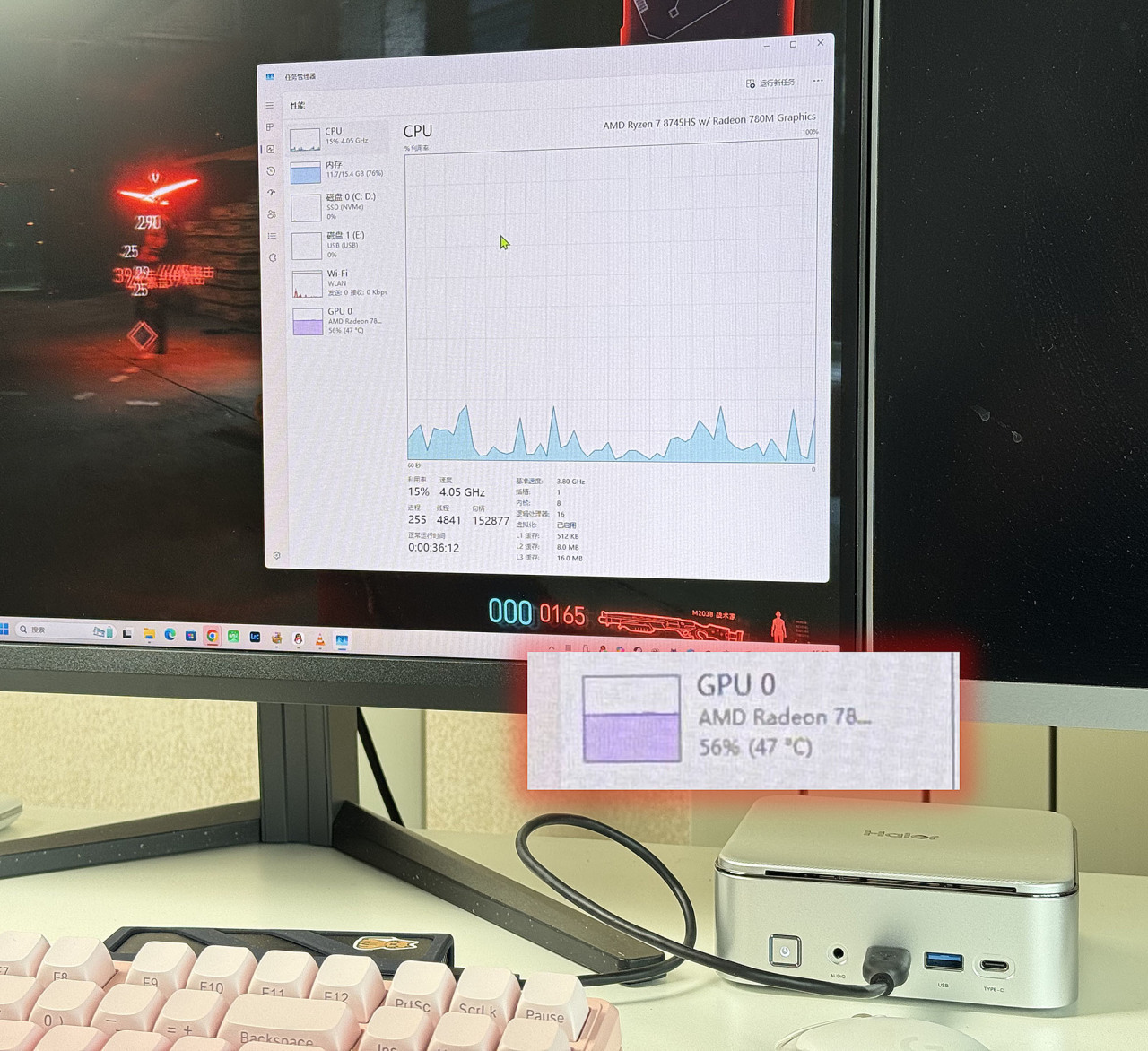 不過,需要注意的是,海爾雲悅mini R搭載的8745H處理器的780M核顯,嚴重依賴於內存性能,由於我這次測試用的機型爲16GB單通道內存,所以在遊戲體驗上會有所折扣。如果你對GPU/遊戲性能比較看重的話,我推薦你買32GB款(雙通道內存),GPU的遊戲性能釋放會更強。