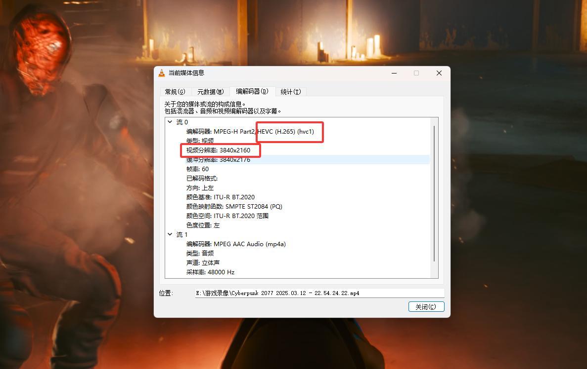 我使用VLC播放器,播放一段HEVC格式的4K分辨率自錄遊戲視頻。
