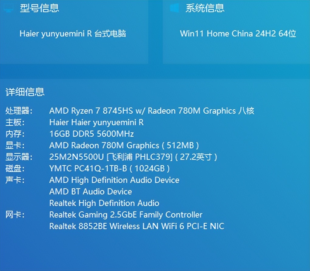 配置信息如上,海爾雲悅mini R用上了AMD Ryzen R7-8745HS處理器,相比8845HS,它去掉了NPU(神經網絡處理單元),卻也讓整機價格更划算了。如果日常沒有使用側端AI應用需求的話,8745HS機型絕對是性價比之選。