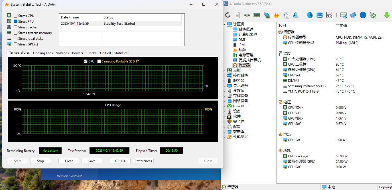 在BIOS中開啓Performance Mode後,在AIDA64穩定性測試中,運行FPU壓力測試,15分鐘的烤機測試中,CPU功耗可以穩定在54瓦。雖然處理器的溫度貼着95攝氏度,但整體沒有過哪怕一次降頻,供電和性能釋放都相當穩定!