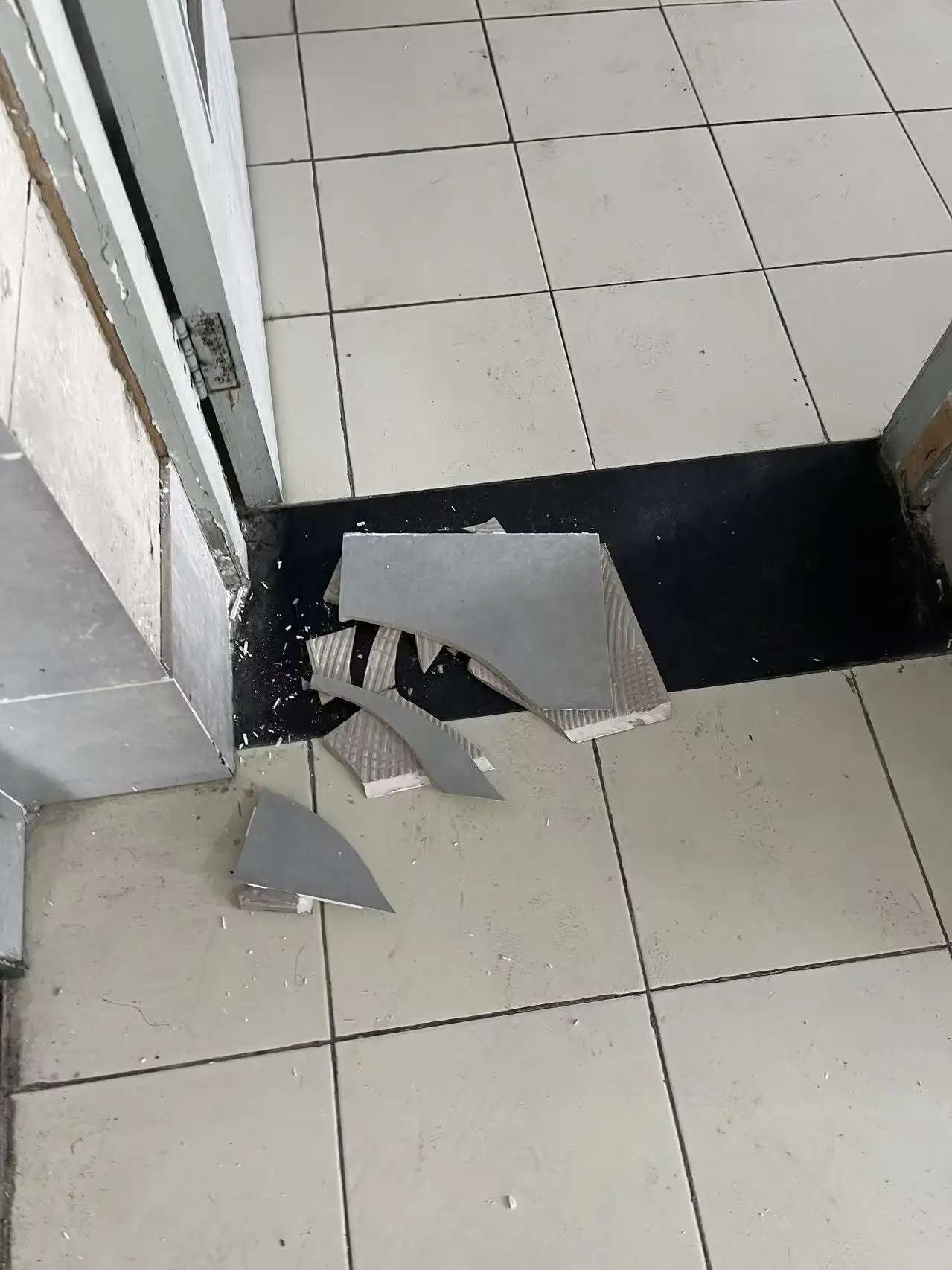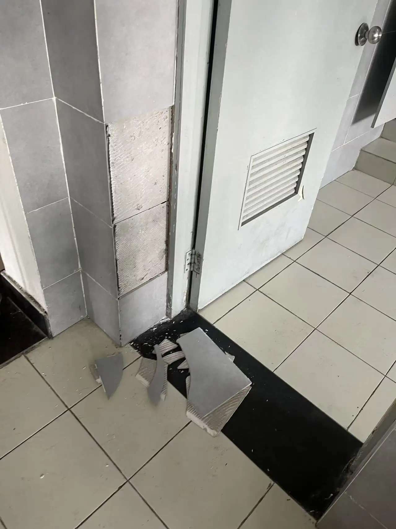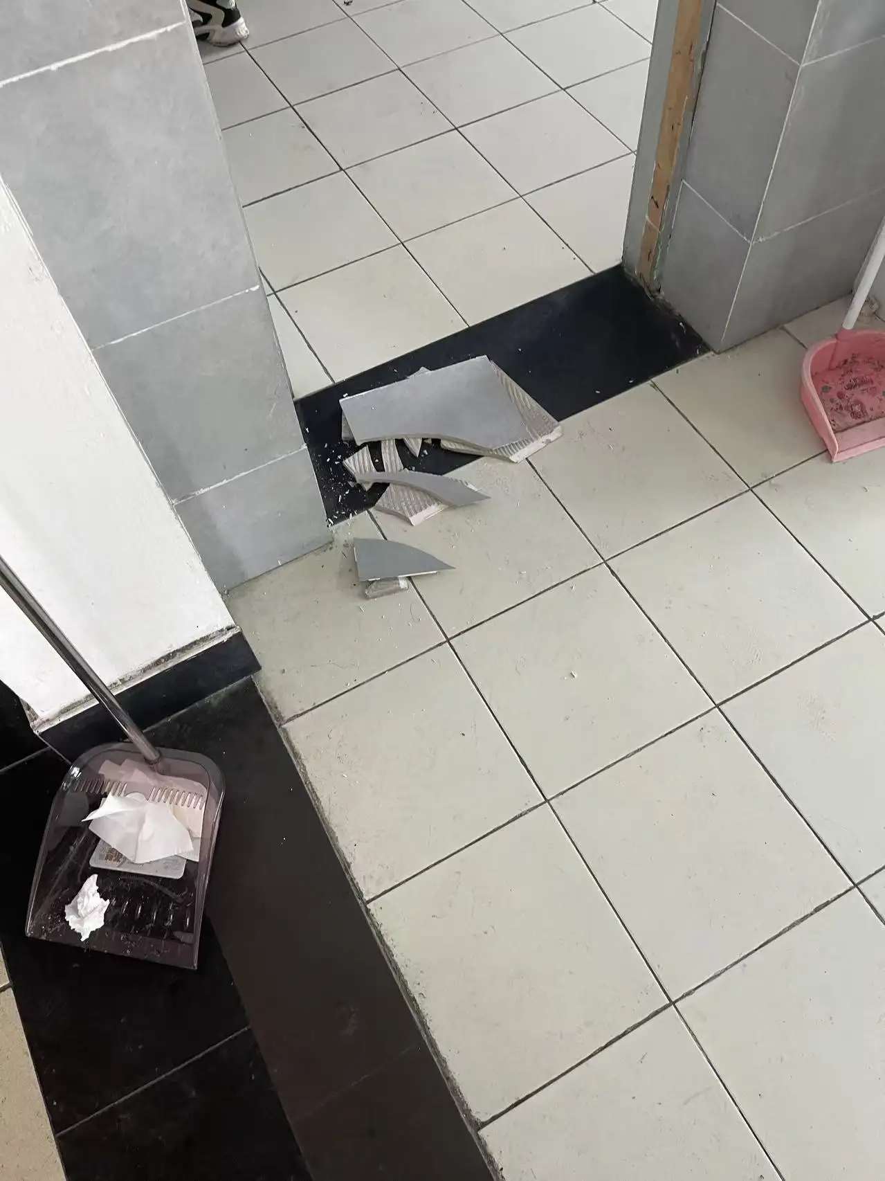 原来不知道是因为受到卫生间的门的反复敲打,还是因为本身老化,靠近门的两块瓷砖从原来的位置上脱落了下来,跌在地上,碎成了好几块。