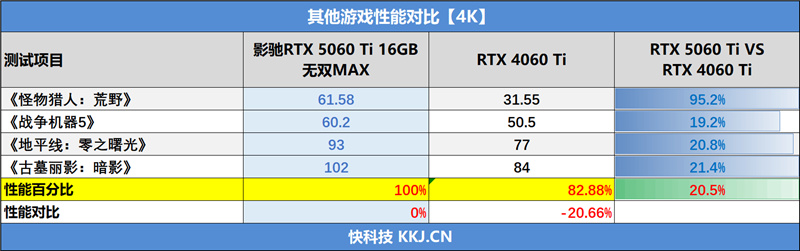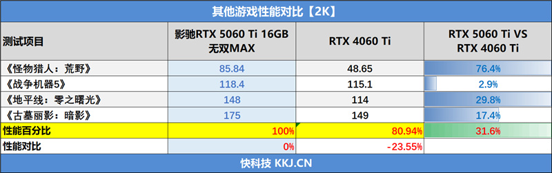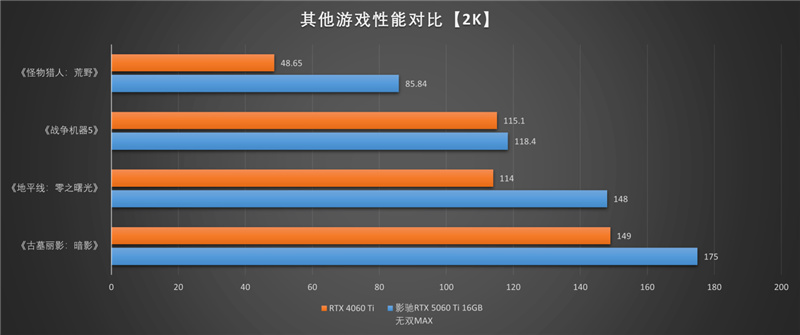 在不支持DLSS 4的遊戲中,影馳RTX 5060 Ti無雙MAX顯卡無論在2K分辨率還是4K分辨率下,都可以保證流暢運行,而且對比上代的RTX 4060 Ti優勢明顯,有平均超過20%的幀數提升。