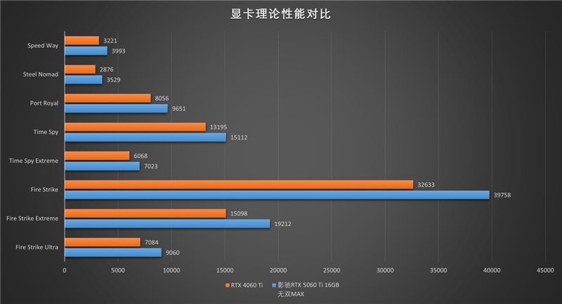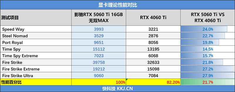 影馳RTX 5060 Ti無雙MAX顯卡雖然採用了單槽的超薄設計,但性能方面並沒有收到影響,相較於上代的RTX 4060 Ti,在3Dmark理論性能測試中成績平均提高約23%,而且還有DLSS 4技術,在遊戲中優勢巨大。