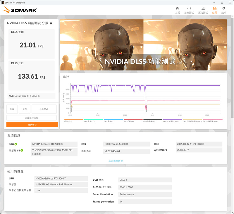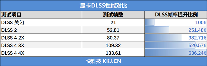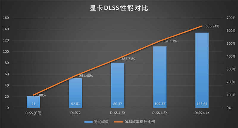 在3Dmark NVIDIA DLSS功能測試中,關閉DLSS 4時幀數爲21FPS左右,開啓DLSS 4 2x之後幀數上升爲80.37FPS,開啓DLSS 4 3x之後幀數上升爲109.32FPS,開啓DLSS 4 4x之後幀數上升爲133.61FPS。