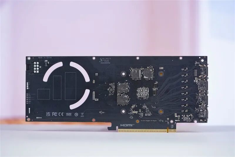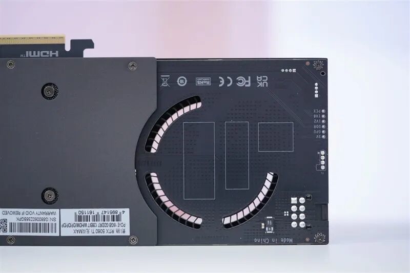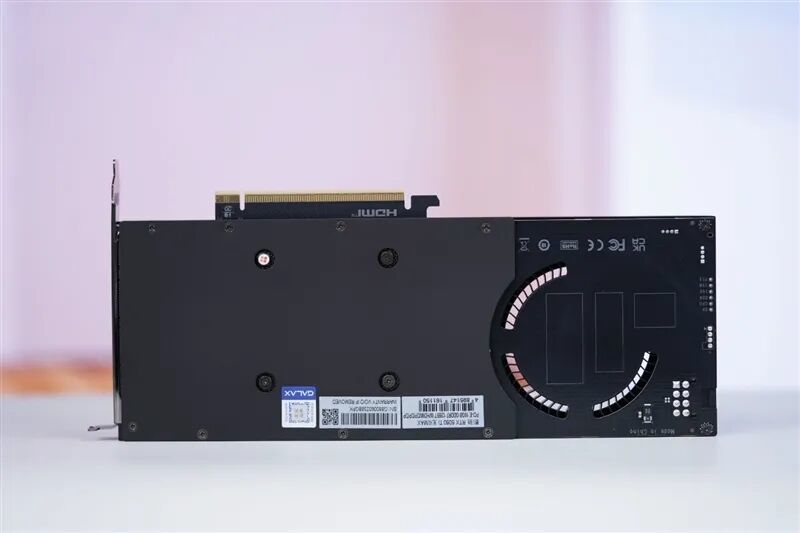 影馳RTX 5060 Ti無雙MAX顯卡背面尾部特寫,可以看到PCB在渦輪風扇位置設計了四分之三的環形開口。