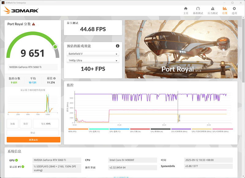 在3Dmark中測試實時光追性能的Prot Royal測試中,總成績爲9651,其中顯卡測試成績爲44.68FPS。