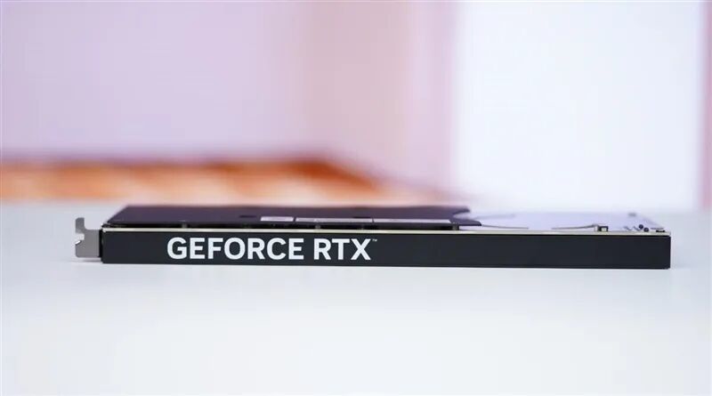 影馳RTX 5060 Ti無雙MAX顯卡的頂部只印了一行“GEFORCE RTX”字樣,單槽顯卡的超薄設計在這個角度一覽無餘。
