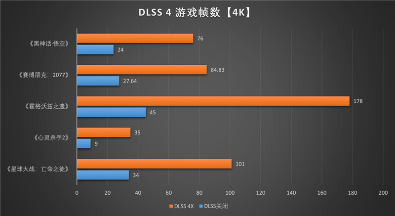 《黑神話·悟空》在開啓DLSS 4最高的4X級別多幀生成時,在4K分辨率下的測試幀率爲76。