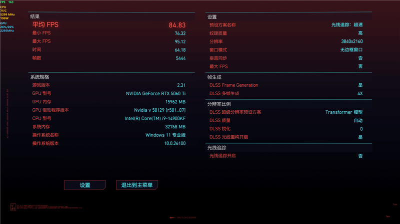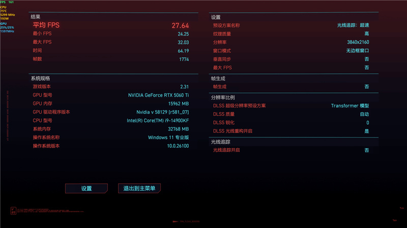 在《賽博朋克:2077》中,我們使用“光線追蹤:超速”預設,並在DLSS中選擇Transformer模型,DLSS超分辨率使用默認的自動,在4K分辨率下,運行自帶的性能測試。