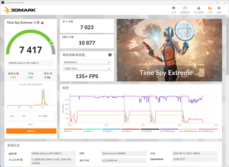 在3DMark的Time Spy Extreme(DX12+4K渲染分辨率)測試中,總成績爲7417,其中顯卡分數爲7023。